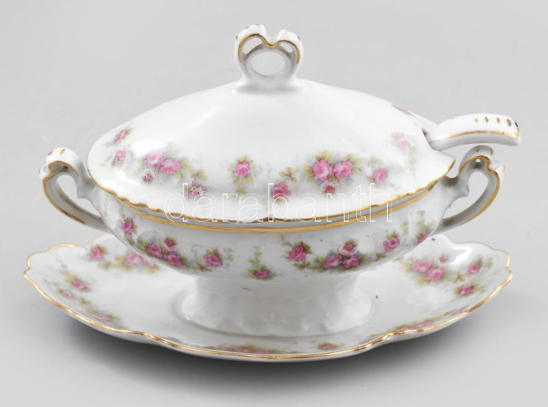 MZ Habsburg-China szószos edény kanállal, Párisi Nagy-Áruház kereskedői jelzéssel. Jelzett, kopással, h: 16 cm