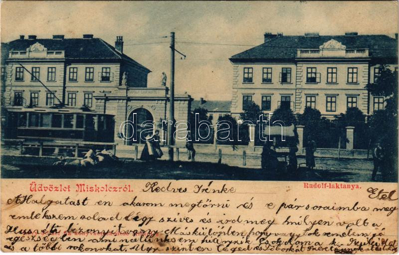 1901 Miskolc, Rudolf laktanya, villamos. Lővy József fia kiadása (fl)