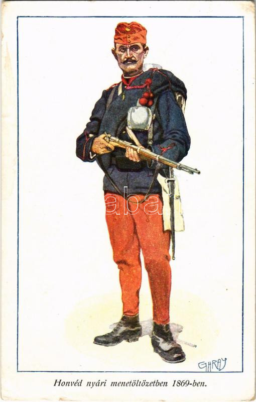 Honvéd nyári menetöltözetben 1869-ben. Honvédség története 1868-1918 / Austro-Hungarian K.u.K. military art postcard, uniform s: Garay (EK)