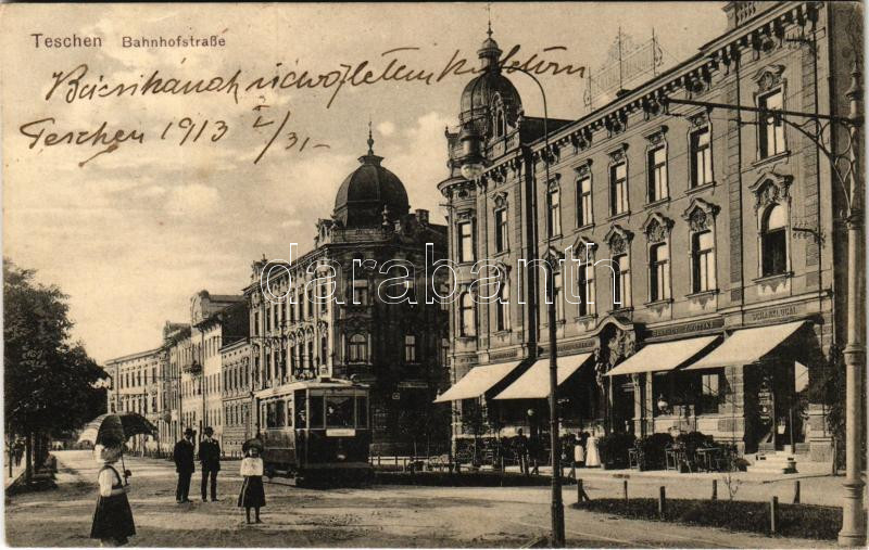 Description: 1913 Cieszyn, Teschen; Bahnhofstrasse, Hotel Central Bahnhof E. Potyka, Schanklocal, Restaurant / Railway street and hotel, restaurant, shops, tram (Rb)