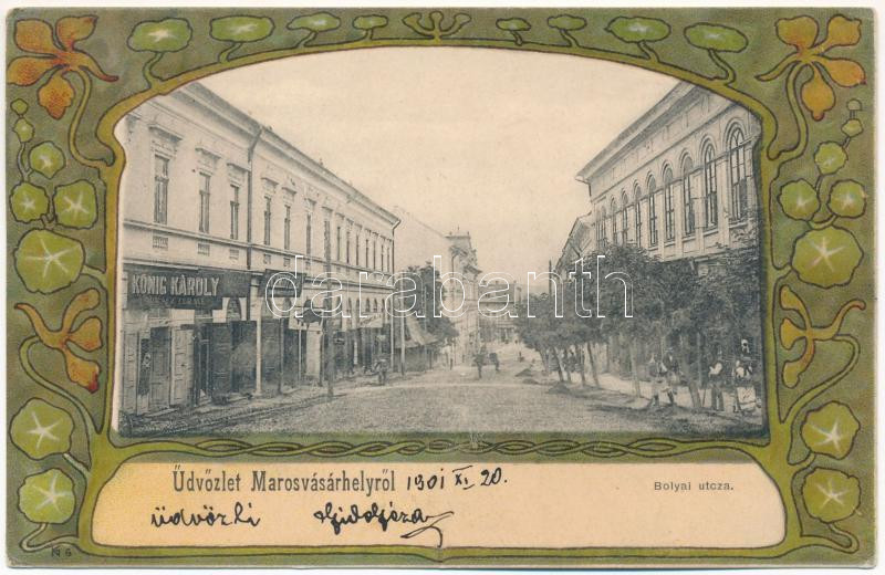 1901 Marosvásárhely, Targu Mures; Bolyai utca, König Károly, Schmidt üzlete. Holbach Ede kiadása. Szecessziós litho keret / street view, shops. Art Nouveau, litho frame (fa)