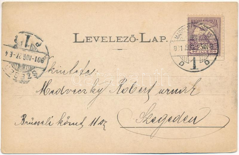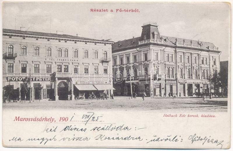 1901 Marosvásárhely, Targu Mures; Fő tér, Hotel Transilvania szálloda és kávéház, Pototzky Péter, Bocsánczy Márton, Böszörményi Lajos, Várady Gyula, Lukács János üzlete. Holbach Ede kiadása / main square, hotel and café, shops (EB)