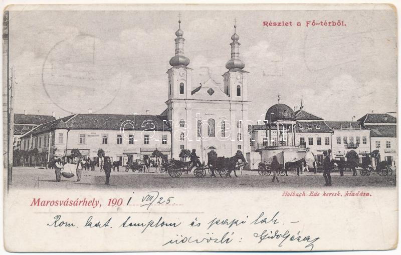 1901 Marosvásárhely, Targu Mures; Fő tér, Mózes József, Petelei János üzlete. Holbach Ede kiadása / main square, shops (fa)