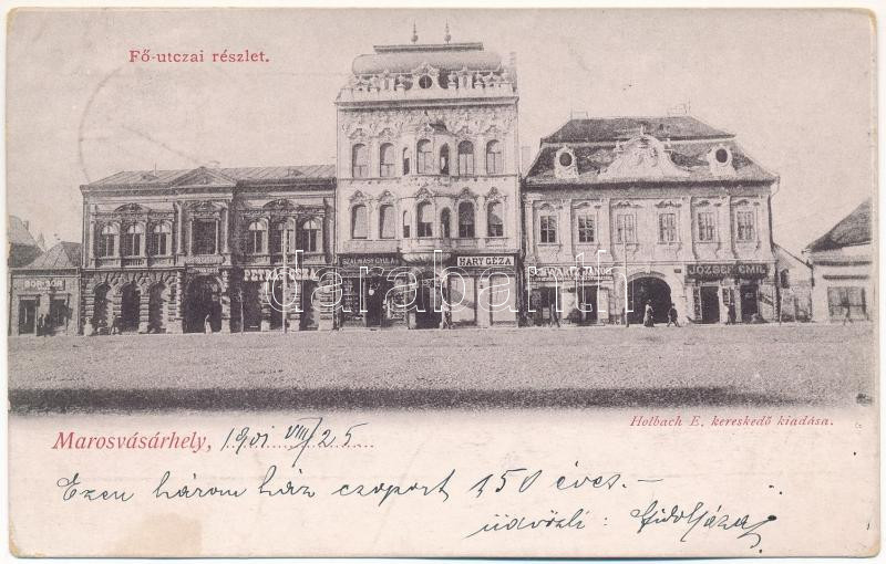 Description: 1901 Marosvásárhely, Targu Mures; Fő utca, Muntyán Géza, Petrás Géza, Szalmásy Gyula, Hary Géza, Schwartz János, József Emil üzlete. Holbach Ede kiadása / main street, shops (EK)