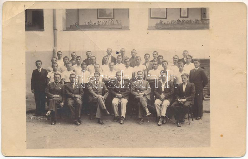 1936 Vajdahunyad, Hunedoara; Absolventi cursului profesional de ucenici / Szakmunkásképző tanfolyamot végzettek csoportja / graduates of the professional apprentice course. Fitzner photo (lyuk / pinhole)