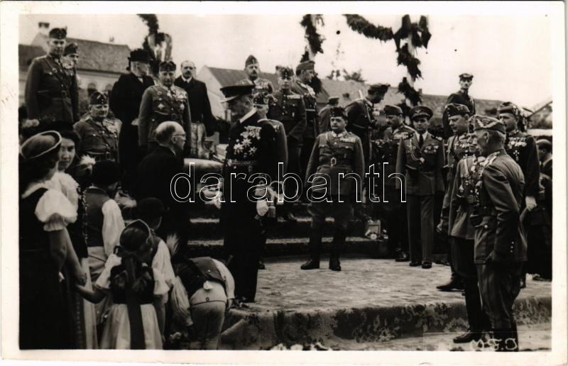 Description: 1940 Szászrégen, Reghin; bevonulás, Vitéz Nagybányai Horthy Miklós Magyarország kormányzója és Purgly Magdolna / entry of the Hungarian troops, Regent Horthy and his wife + "1940 Szászrégen visszatért" So. Stpl.