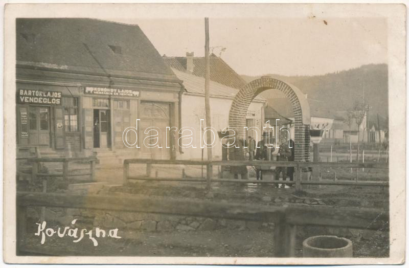 Kovászna, Covasna; Bartók Lajos vendéglős, Köröndy Lajos mészáros és hentes üzlete, borvíz kút / shops, restaurant, mineral water fountain. photo (fl)