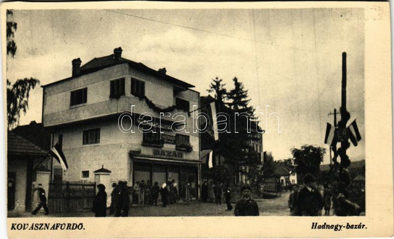 Kovásznafürdő, Baile Covasna; Hadnagy bazár a bevonuláskor, magyar zás... https://www.darabanth.com/en/455-Online-auction/455.0/Postcards/Transylvania~1500006/Kovasznafurdo-Baile-Covasna-Hadnagy-bazar-a-bevonulaskor-magyar-zaszlos-cimer-Kovaszna-~II2954384
