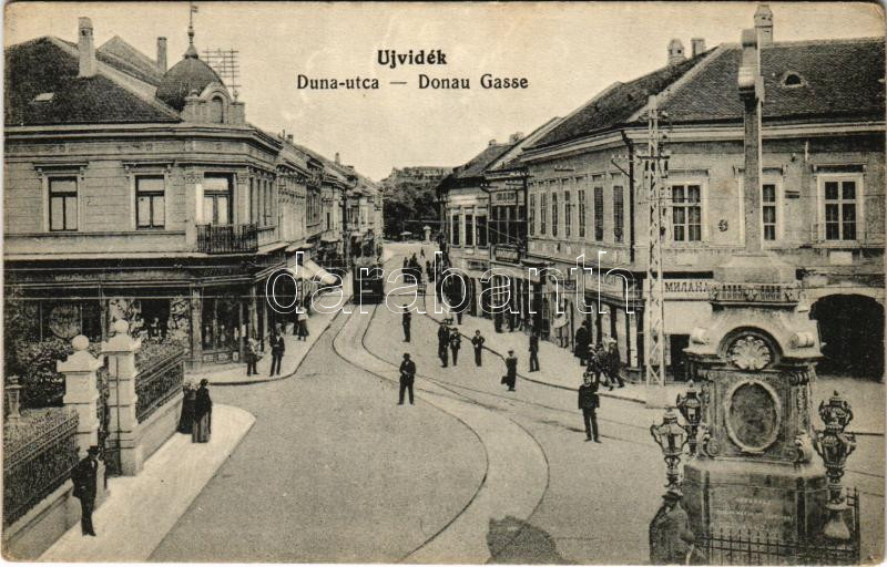 Újvidék, Novi Sad; Duna utca, villamos, Ivkovic Milan és Dietzgen üzlete. Hajós tőzsde kiadása / street, tram, shops
