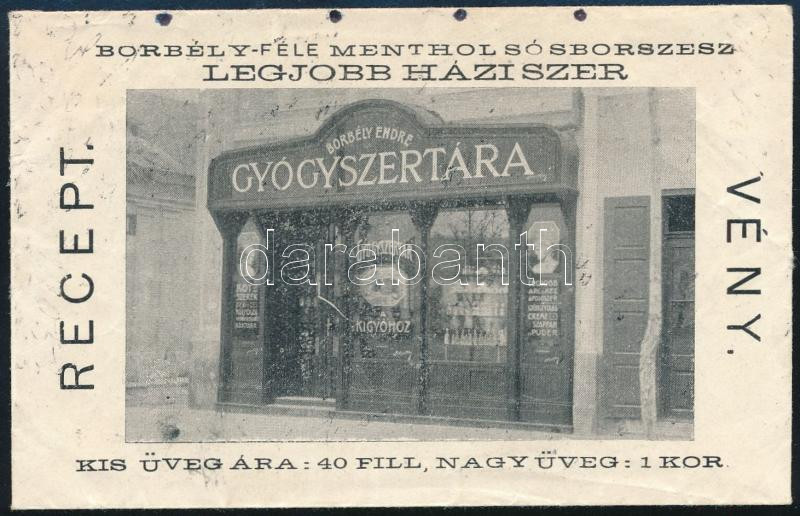 Borbély Endre gyógyszertára receptboríték, a patika képével, hátoldalá...