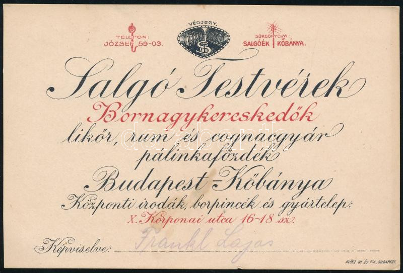 cca 1920 Salgó Testvérek bornagykereskedők reklám nyomtatvány