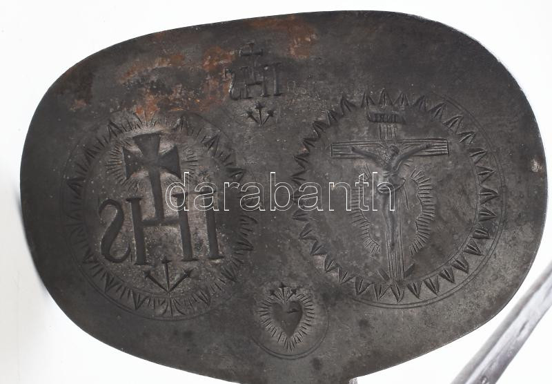 cca 1800 Templomi ostyasütő, szakrális motívumokkal díszített, vas, h:...