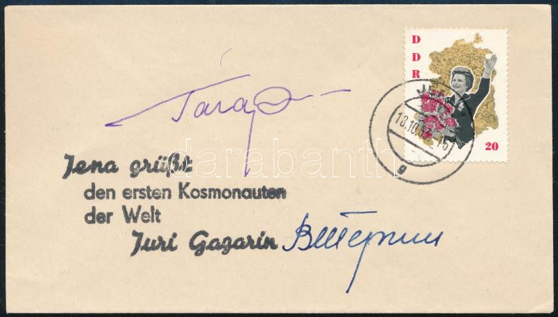 Description: Jurij Alekszejevics Gagarin (1934-1968) és Valentyina Tyereskova (1937- ) szovjet űrhajósok aláírásai emlékborítékon /