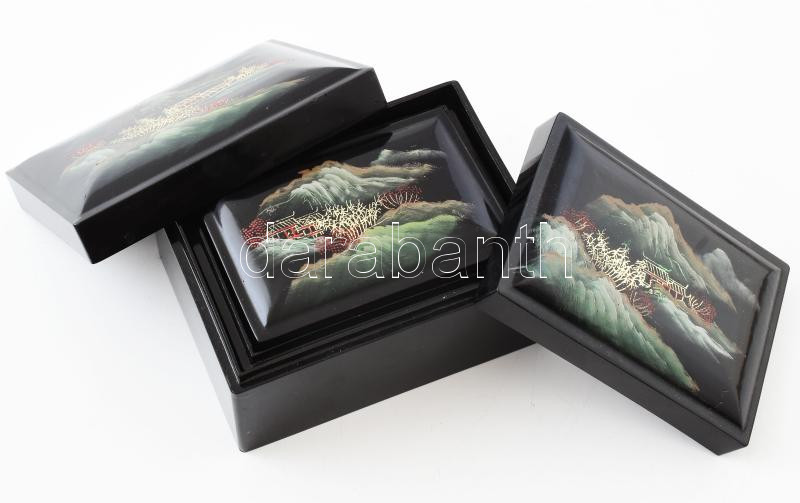 5 darabos egymásba rakható lakkozott doboz szett, keleties dekorral, 1...
