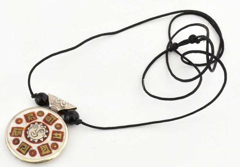 Réz berakással, buddhista szimbólumokkal díszített, kétoldalas régi indiai medál, Buddha szeme, fekete zsinóron, d: 3,5 cm