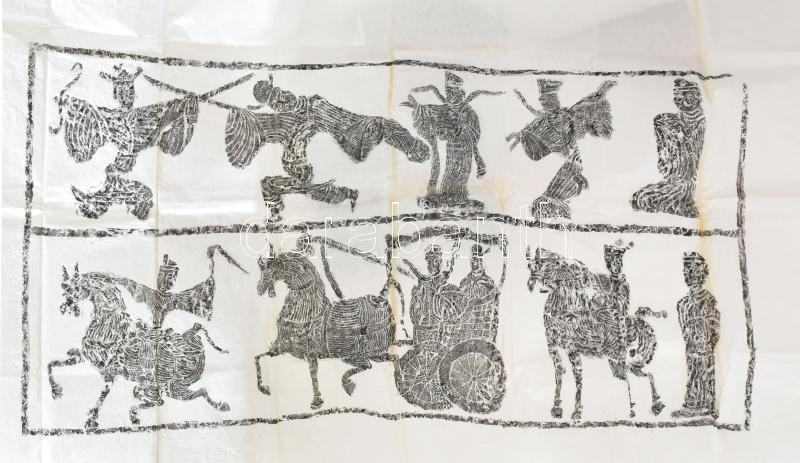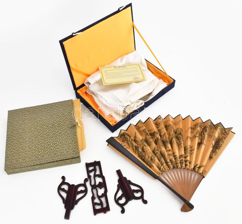 Description: Kínai tétel: Xuzhou Han dinasztia alatt készült antik portré modern másolata díszdobozban leírással 100x100 cm + Fából készült kínai állvány díszdobozban + legyező 32 cm
