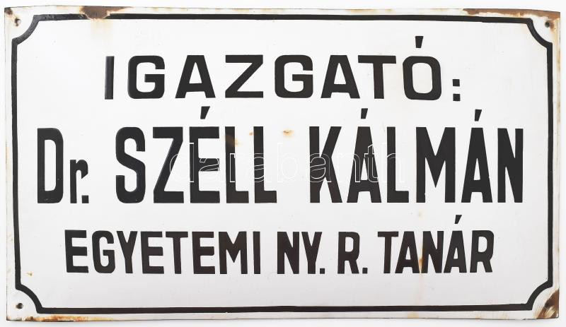 Régi zománcozott fémtábla, "Igazgató: Dr. Széll Kálmán egyetemi ny. r. tanár" felirattal, kis sérülésekkel, 25x45 cm