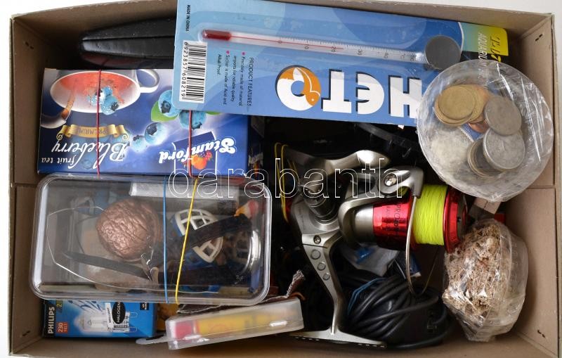 Vegyes bolha tétel: ellenállás/árammérő műszer, óra, fejhallgató, hőmérő, magyar kártya, 4-es elosztó, tengeri csiga, horgászorsó, pénzérmék, stb.