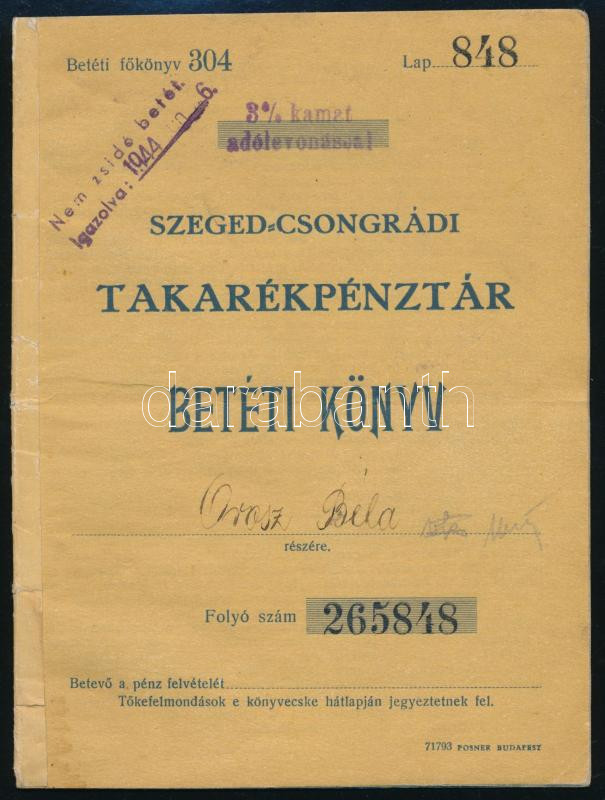 1944 A Szeged Csongrádi Takarékpénztár betéti könyve, a borítón "Nem z...