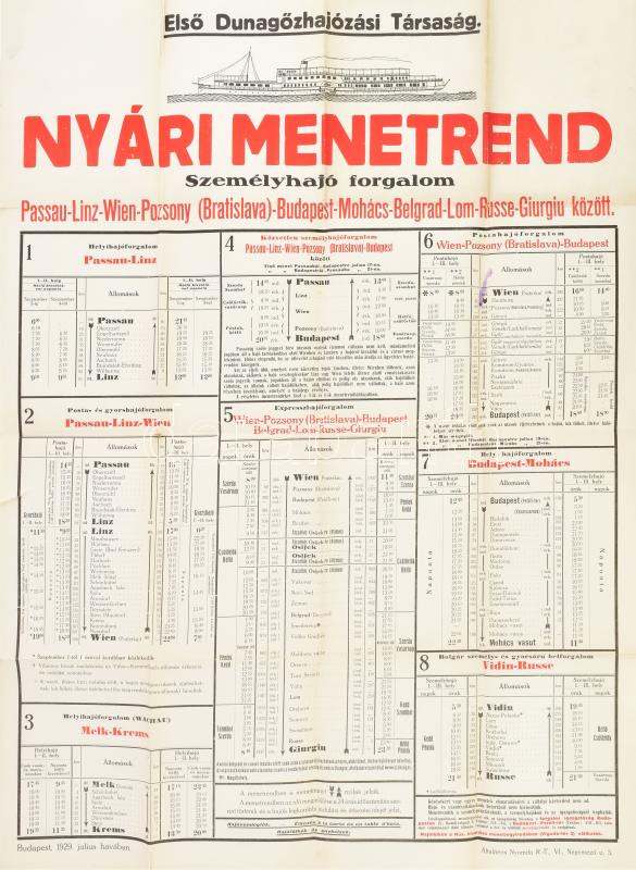 Description: 1929 Első Dunagőzhajózási Társaság (DDSG) nyári menetrend, személyhajó forgalom Passau-Linz-Wien-Pozsony (Bratislava)-Budapest-Mohács-Belgrad-Lom-Russe-Giurgiu között. Hirdetmény, plakát. Bp., Általános Nyomda Rt., hajtva, kisebb lapszéli szakadásokkal, 63x47 cm