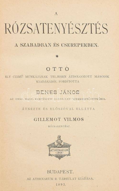 Bp, 1893, Athenaeum... https://www.darabanth.com/en/456-Online-auction/456.0/Books/Books-Gastronomy-and-Gardening~1000046/Otto-Adolph-OttoBenes-Janos-A-rozsatenyesztesBp-1893-Athenaeum-R-Tarsulat-VIII-p-plus-139-p~II3033412