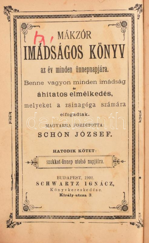Description: Mákzór imádságos könyv az év minden ünnepnapjára. Benne vagyon minden imádság és áhitatos elmélkedés, melyeket a zsinagóga számára elfogadtak. Ford.: Schön József. VI. kötet: Szukkot-ünnep utolsó napjáira. Bp., 1902, Schwartz Ignácz (Neumayer Ede-ny.), 256+16 p. Magyar és héber nyelven. Kiadói dombornyomott egészvászon-kötés, néhány lap kissé foltos.