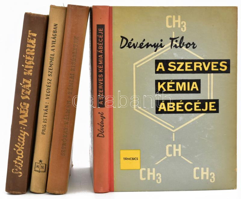 4 db kémiai témájú könyv: Sztrókay Kálmán: Kémiai kÃsérletek; Még száz kÃsérlet; Pais István: Vegyész szemmel a világban; Dévényi Tibor: A szerves kémia ábécéje. Kiadói félvászon-kötés, vegyes állapotban.
