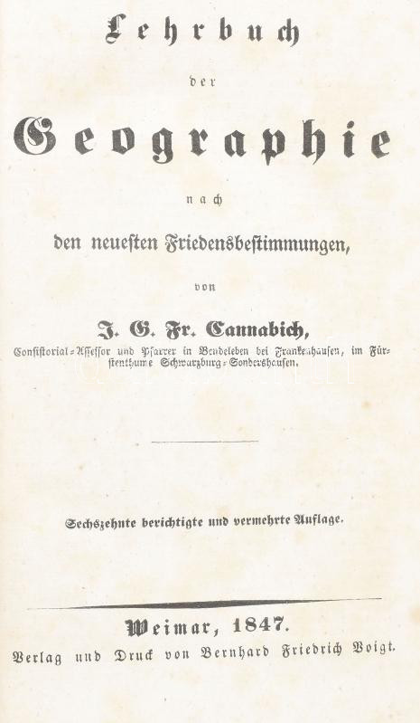 Cannabich, J. G. Fr.: Lehrbuch der Geographie. Weimar, 1847, Voigt. Né... https://www.darabanth.com/en/456-Online-auction/456.0/Books/Books-Natural-sciences-Medicine~1000022/Cannabich-J-G-Fr-Lehrbuch-der-Geographie-Weimar-1847-Voigt-Nemet-nyelven-16-bovitett~II3050890
