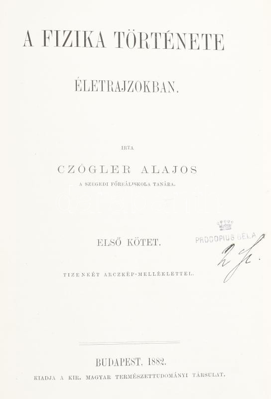 Czógler Alajos: A fizika története életrajzokban. I-II. köt. Természettudományi Könyvkiadó Vállalat. XX-XXI. köt.Bp., 1882, Kir. M. Természettudományi Társulat, XVI+590+2 p.+ 12 t., IX+1+592 p. + 11 t. A II. kötet végén más könyvből származó lapokkal. Kiadói aranyozott egészvászon-kötés, Molnár Mihály-kötés, kopott borítóval, a II. kötetben laza, kissé sérült kötéssel. Bennük Procopius Béla (1868-1945) numizmatikus, későbbi athéni nagykövet névbélyegzőivel.