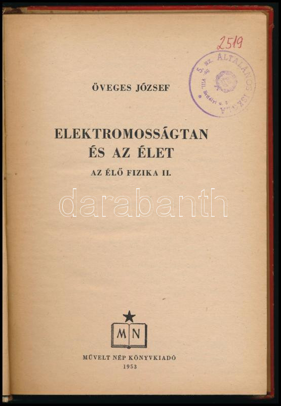Öveges József: Elektromosságtan és az élet. Az élő fizika II. Bp., 1953, Művelt Nép, 283 p. Kiadói félvászon-kötés, kopott borítóval, intézményi bélyegzőkkel.