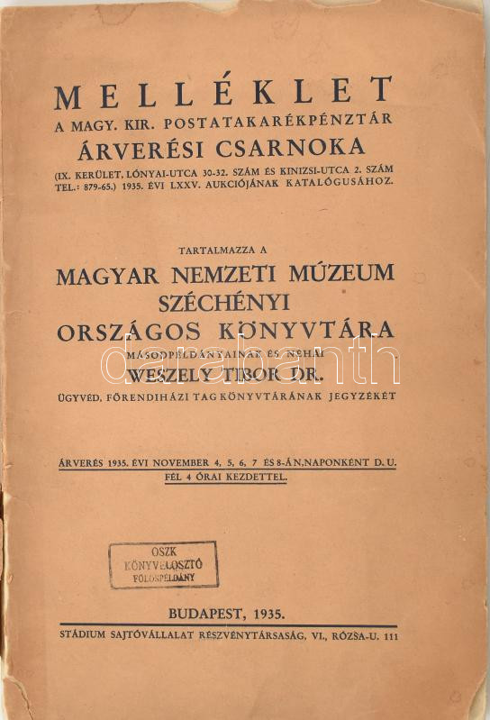Description: 1935 Melléklet a M. Kir Postatakarékpénztár Árverési Csarnoka 1935. évi LXXV. aukciójának katalógusához. Tartalmazza a Magyar Nemzeti Múzeum Széchenyi Országos Könyvtára másodpéldányainak és néhai Weszely Tibor Dr. ügyvéd, főrendiházi tag könyvtárának jegyzékét. Bp., 1935, Stádium. Kiadói papírkötés, sérült borítóval, intézményi bélyegzéssel.