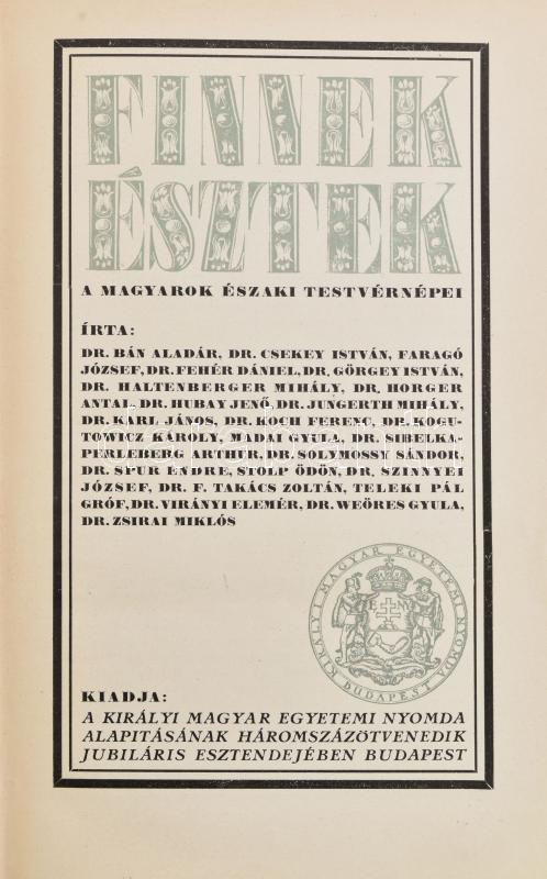 Finnek, észtek. A magyarok északi testvérnépei. Írták: Horger Antal, Hubay Jenő, Kogutowicz Károly, Teleki Pál és mások. Bp., 1928, Kir. M. Egyetemi Nyomda, 335 p. Fekete-fehér képekkel illusztrálva. Kiadói kartonált papírkötés, kissé viseltes borítóval, tulajdonosi névbélyegzővel.