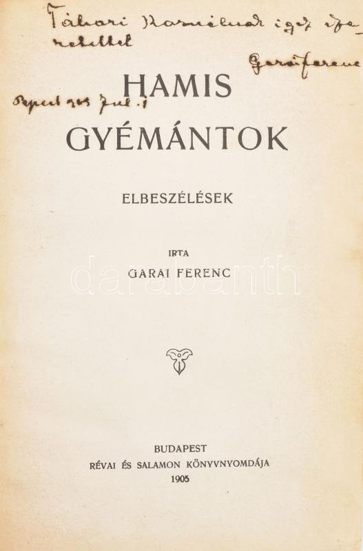 Garai Ferenc: Hamis gyémántok. A szerző, Garai Ferenc (1876-1949) újságíró, író által Tábori Kornél (1879-1944) író, újságírónak DEDIKÁLT! Bp., 1905, Révai. Könyvkötői (Érszhegyi Géza), aranyozott gerincű félvászon kötésben, márványozott lapélekkel, szennylap sérült, helyenként kissé foltos lapokkal.