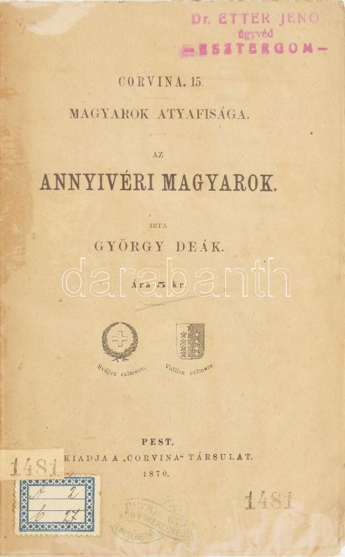 https://www.darabanth.com/en/456-Online-auction/456.0/Books/Books-Other-rarities~1000034/Gyorgy-Deak-Annyiveri-magyarok-1870-Pest-Corvina-Tarsulat-papirkotes~II3050837