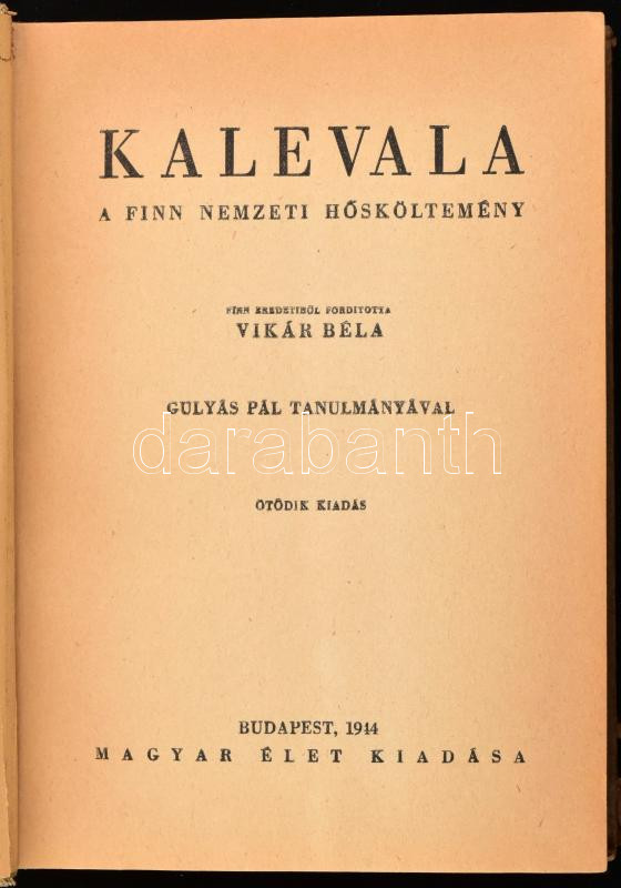 Kalevala. A finn nemzeti hősköltemény. Ford.: Vikár Béla. Gulyás Pál t... https://www.darabanth.com/en/456-Online-auction/456.0/Books/Books-Other-rarities~1000034/Kalevala-A-finn-nemzeti-hoskoltemeny-Ford-Vikar-Bela-Gulyas-Pal-tanulmanyaval-Bp-1944-~II3049253