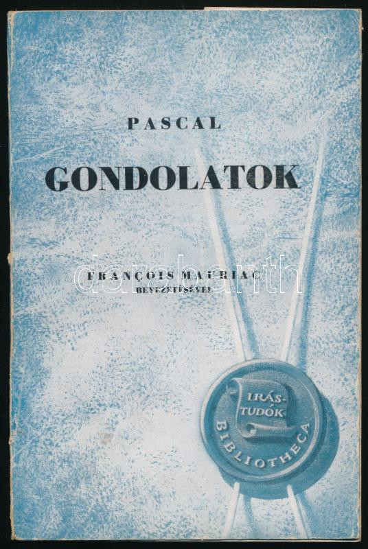 Pascal, Blaise: Gondolatok. Ford.: Fónagy Iván. Francois Mauriac bevezetésével. Bp., 1944, Bibliotheca. Kiadói papírkötés, kissé sérült, a könyvtesttől különvált borítóval.
