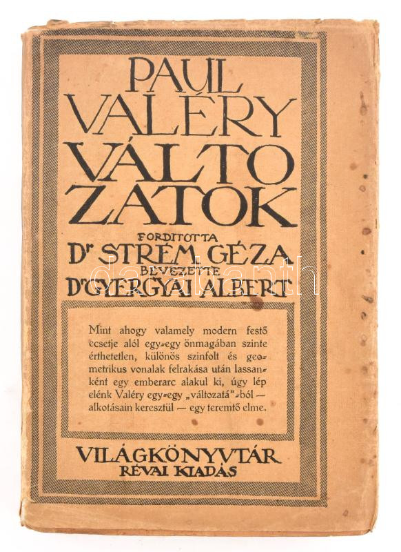 Paul Valéry: Változatok. Ford.: Strém Géza. Gyergyai Albert bevezetésé... https://www.darabanth.com/en/456-Online-auction/456.0/Books/Books-Other-rarities~1000034/Paul-Valery-Valtozatok-Ford-Strem-Geza-Gyergyai-Albert-bevezetesevel-Vilagkonyvtar-Bp-~II3049840