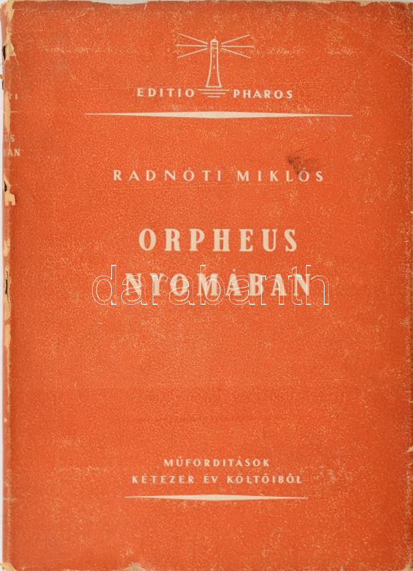 Description: Radnóti Miklós: Orpheus nyomában. Műfordítások kétezer év költőiből. A fametszeteket Kaza György és Társa grafikai intézet készítette, a tipográfia és a borító Csillag Vera munkája. Bp., 1943, Pharos, 191 p. Első kiadás. Kiadói papírkötés, kopott, kissé sérült kiadói papír védőborítóban.