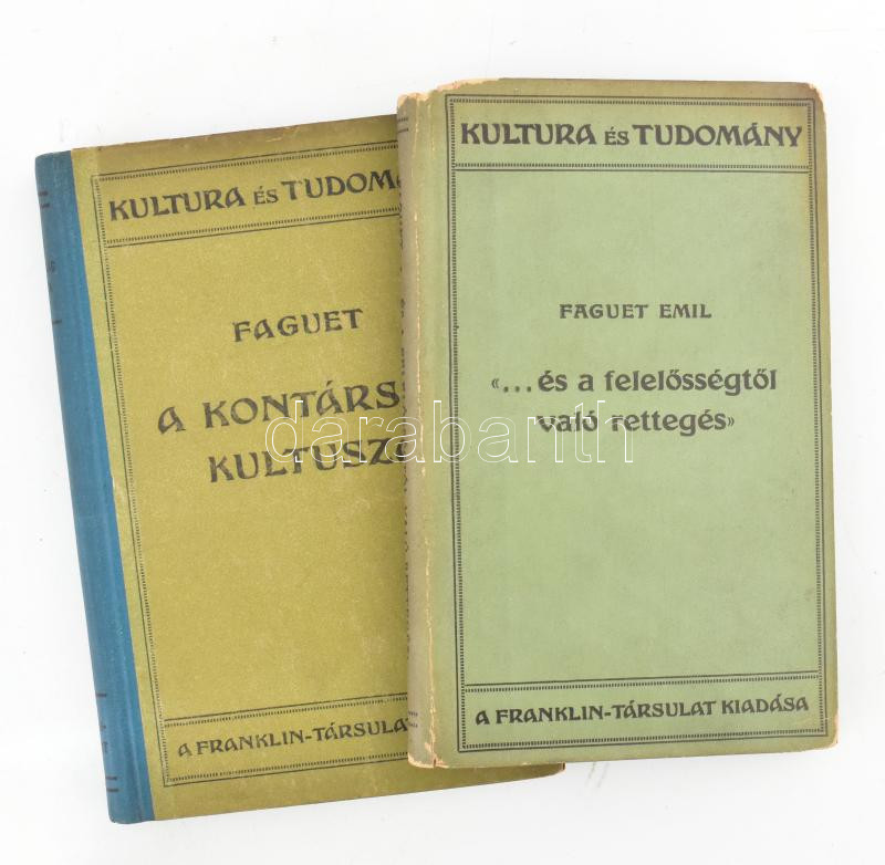 Faguet Emil: A kontárság kultusza. Ford. és jegyzetekkel kÃsérte Dr. Szánthó Gyula. Kultura és Tudomány. Bp., 1919, Franklin. Kiadói félvászon-kötés. + Faguet Emil: "...és a felelÅ‘sségtÅ‘l való rettegés." A kontárság kultuszának folytatása. Ford. és jegyzetekkel kÃsérte Dr. Szánthó Gyula. Kultura és Tudomány. Bp., 1922, Franklin. Kiadói kartonált papÃrkötés, kissé sérült gerinccel.