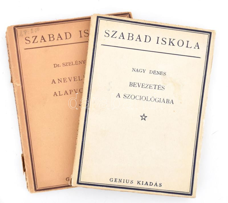 Nagy Dénes: Bevezetés a szociológiába. Szabad Iskola III. köt. Bp., 1922., Genius. Kiadói papírkötés. + Szelényi Ödön: A neveléstan alapvonalai. Szabad Iskola V. köt. Bp., 1922., Genius. Kiadói papírkötés, szakadt, sérült gerinccel, a könyvtest elvált a borítótól,