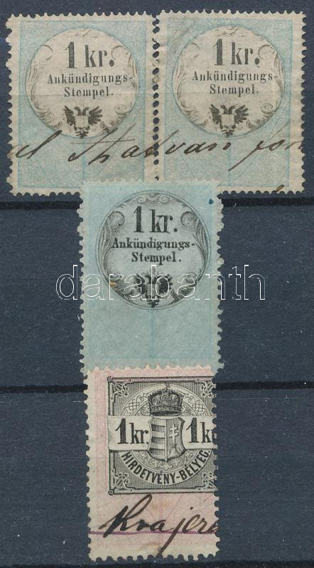 4 db hirdetményilleték-bélyeg, egyik látványos elfogazással