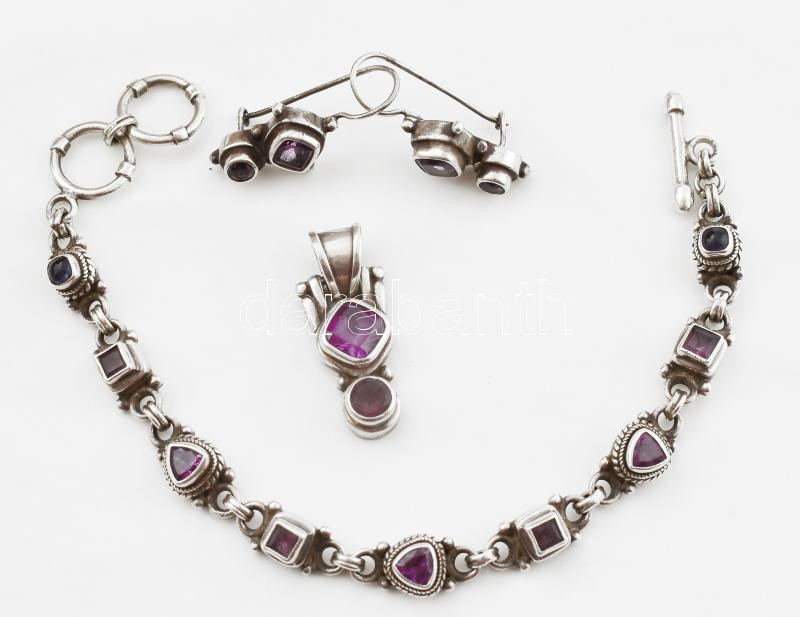 Ezüst(Ag) ékszerszett ametiszttel, fülbevalópár, karkötő, medál, jelzett, bruttó: 31,7 g