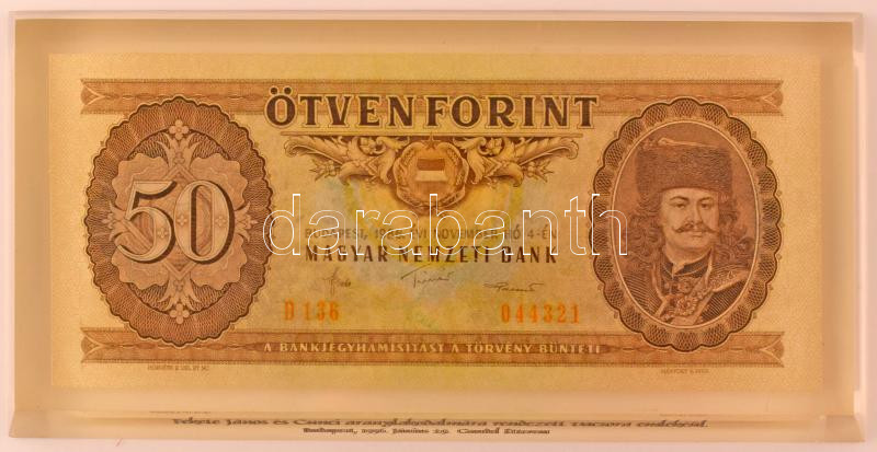 1986. 50Ft "D 136 044321" Fekete János, az MNB akkori elnökének aláírásával, plexi tömbben, Fekete János és felesége aranylakodalmára készítve.