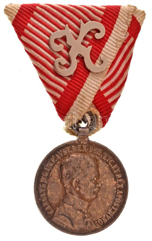 1917. "Károly Ezüst Vitézségi Érem II. osztálya" peremen jelzett Ag ki... https://www.darabanth.com/en/456-Online-auction/456.0/Numismatics/Military~2000019/1917-Karoly-Ezust-Vitezsegi-Erem-II-osztalya-peremen-jelzett-Ag-kituntetes-modern-mellszalagon~II3015264
