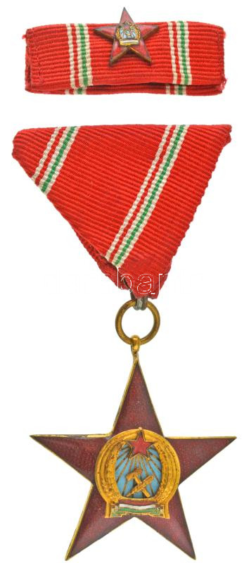 Description: 1949. "A Magyar Népköztársasági Érdemérem arany fokozata" aranyozott, zománcozott bronz kitüntetés mellszalagon, szalagsávon miniatűrrel T:XF Hungary 1949. "Medal of Merit of the Hungarian Peoples Republic Gold class" gilt, enamelled bronze decoration on ribbon, with miniature ribbon and miniature C:XF NMK 534.