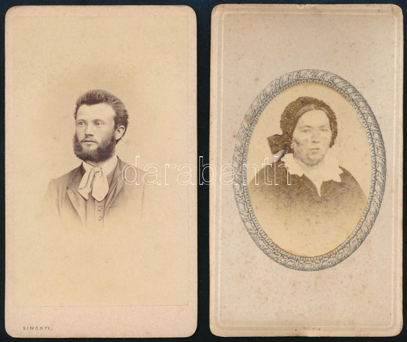 cca 1865 Szakállas fiatalember és idős hölgyi portréfotói, keményhátú fotók Simonyi pesti műterméből, az egyik felületén kis foltokkal, 10x6 cm