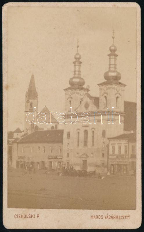 cca 1900 Marosvásárhely, templomok, Törpényi János Vaskereskedése, keményhátú fotó Ciehulski műterméből, 10,5×6,5 cm / Targu Mures