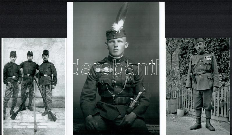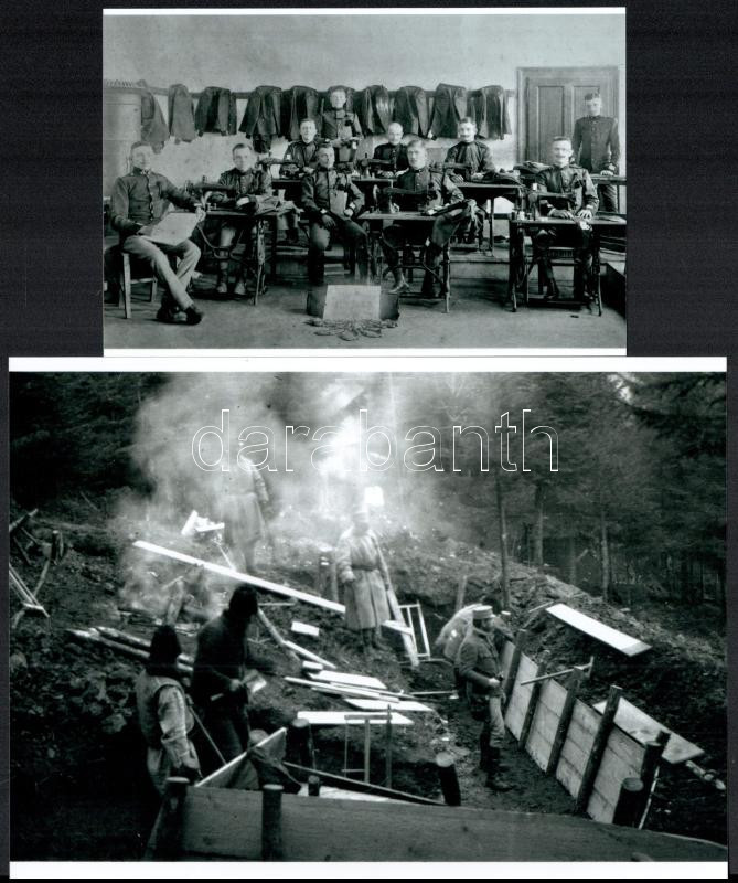 Description: cca 1945 előtt készült felvételek katonákról (lövészárokban, szabóműhelyben, műteremben, stb.), 5 db modern nagyítás, jelzés nélkül, 21x15 cm és 10x15 cm