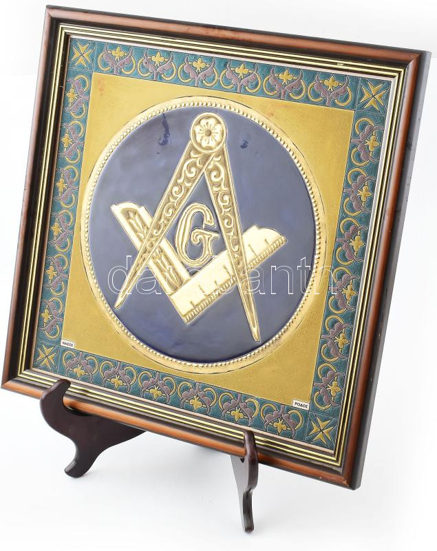 Szabadkőműves nagy méretű kerámia fali dísz. Nassos, Rodos. Jelzett mázas kerámia, kézzel festett, fa keretben 30x30 cm