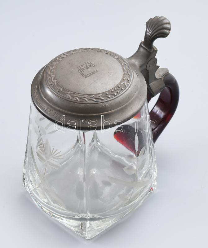 1936 Csiszolt mintás üvegkorsó, bíborszínezett füllel, ón fedővel, 193...